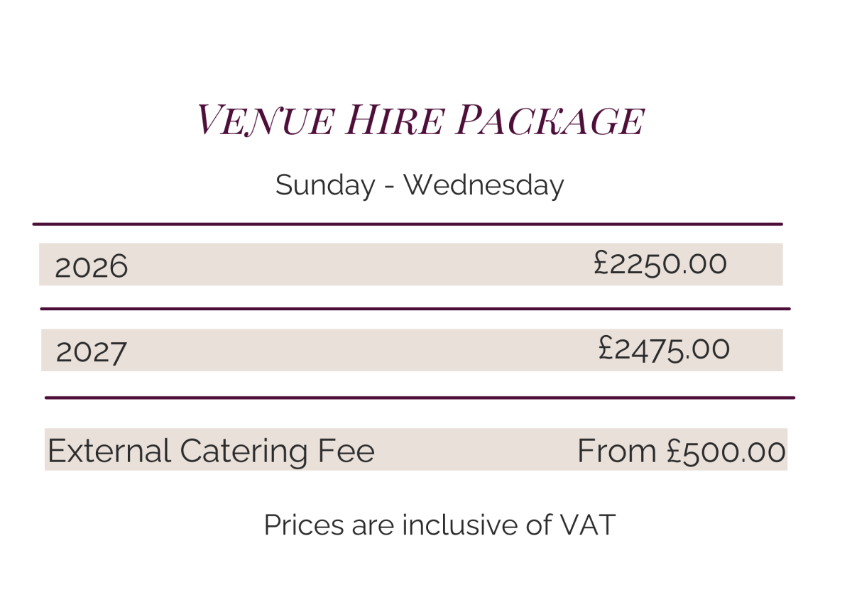 The venue hire package includes exclusive use of the venue on the day, from 9am through to 1am. That time is there for set up, the celebration itself, and a relaxed de-rig afterwards. All standard additional extras are included as part of the package.